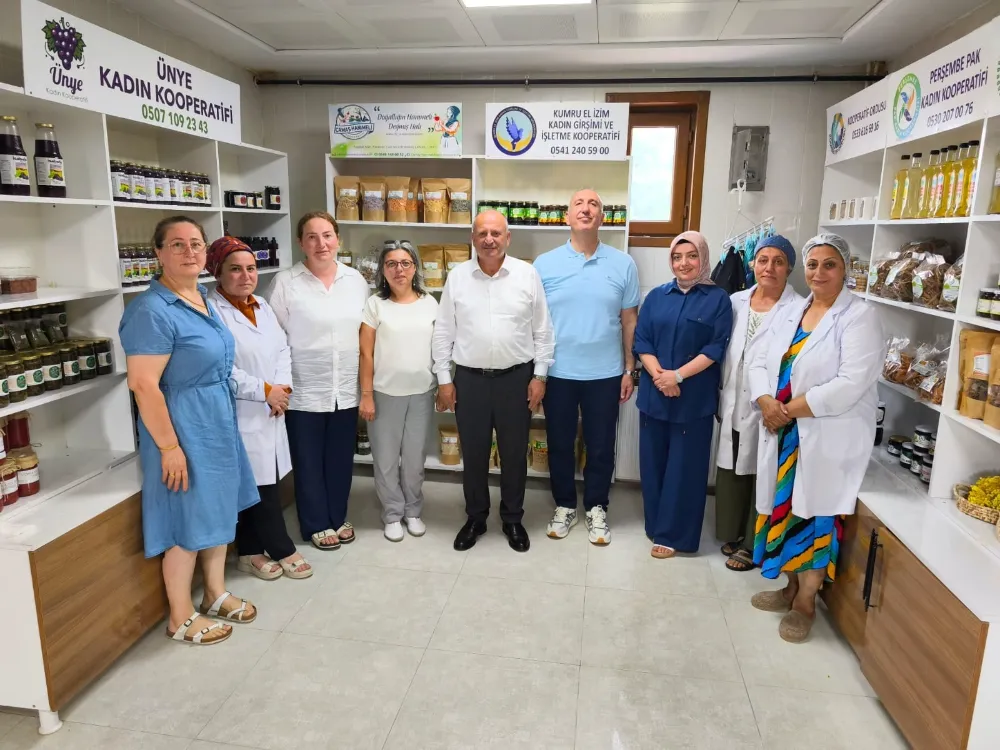 Ünye Belediye Başkanı Hüseyin Tavlı, Doğu Karadeniz Kalkınma Ajansı (DOKAP) Başkanı Hakan Gültekin ile birlikte “Yöresel Ürünler Kadın Eli ile Ekonomiye Dönüşüyor” projesi kapsamında kurulan ve faaliyetlerini Ünye Kadın Kooperatifi çatısı altında sürdüren üretim ve satış noktasını ziyaret etti.