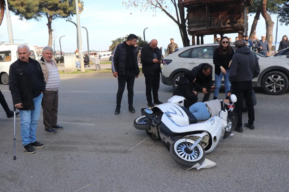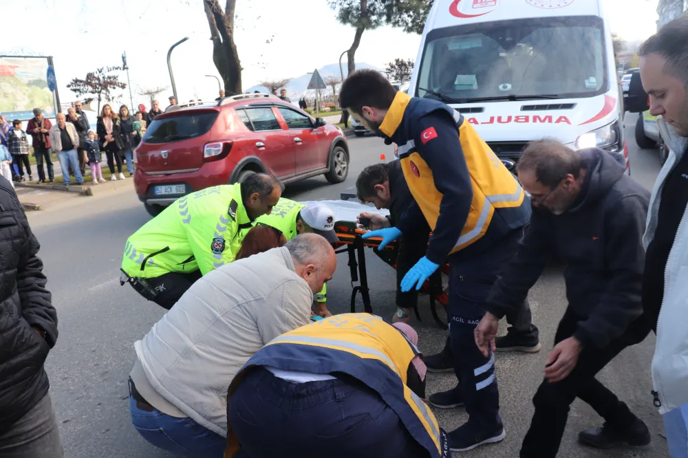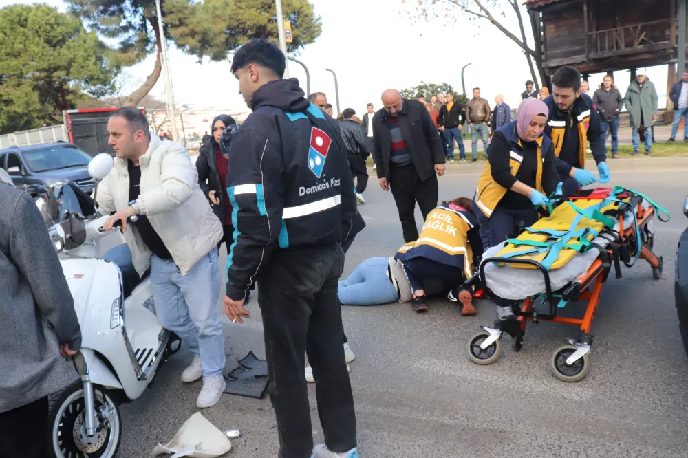 Motosiklet sürücüsü kadın çarpışmanın etkisiyle yere düşerek yaralandı.