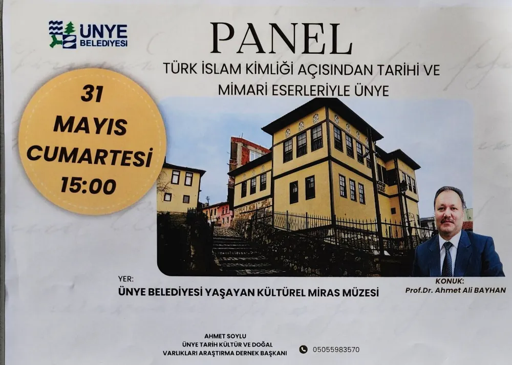 Dernek tarafından organize edilen “Türk İslam Kimliği Açısından Tarihi ve Mimari Eserleriyle Ünye” konulu panel, 31 Mayıs 2025 Cumartesi günü saat 15.00’te Ünye Belediyesi Yaşayan Kültürel Miras Müzesi’nde gerçekleştirilecek.